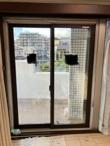 障子を吊り込んで完成かのように見えますが、窓の内側に樹脂の額縁を取り付ける作業があります。