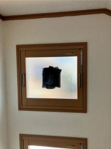 吹き抜けにある窓だったので、室内足場を立てての施工でした。