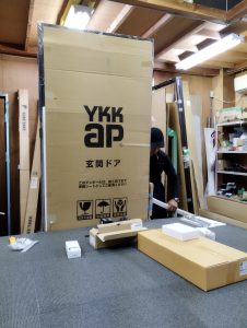 こんにちは湊です。今日は工務の人がサッシの組み立てをしていたので組み立て風景を撮らせてもらいました!これはリフォーム用玄関の組み立てをしている様子になります。作業台の上にはハンドルや丁番といった部材の箱が置かれています。今から組み立てる為に先に部材を集めてからまとめて組み立てをしているみたいです。効率が良いですね!頑張って組み立ててください!