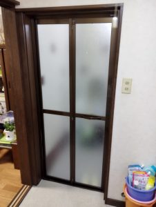 こんにちは湊です。今回の工事は浴室折れ戸の取り替え工事になります。元の浴室ドアになります。動かしてみると動きが悪く、引っかかるようなところも有りました。