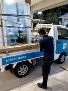 本日は、同僚の梅本くんが積み込んでいる風景です。積み込んでいるのは内窓ですね。